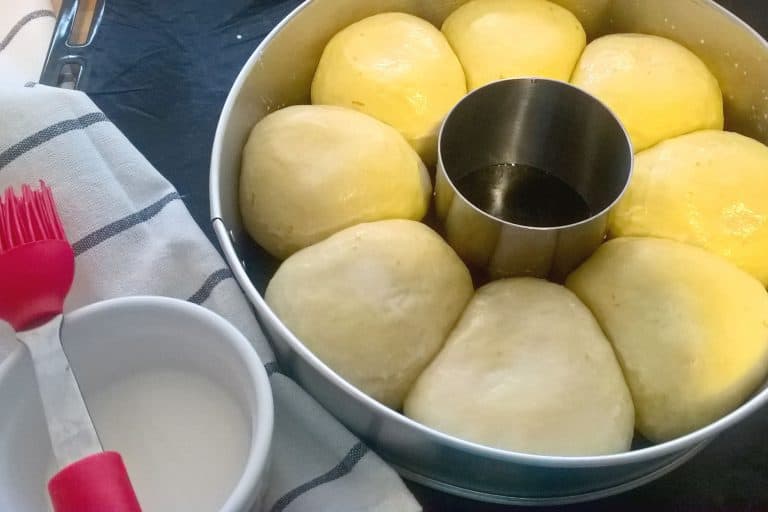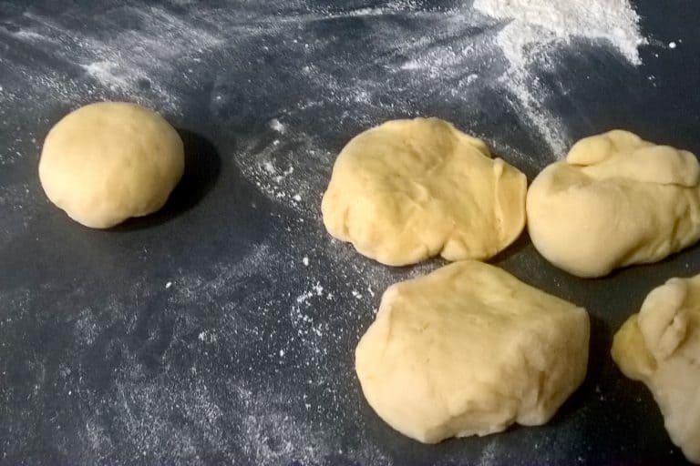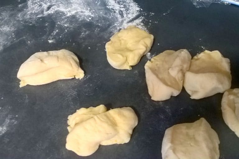 Dobře vykynuté těsto vyklopíme z mísy na pomoučněný vál a chvíli jemně hněteme, poté z něho vyválíme váleček a ten rozdělíme na osm stejně velkých dílů. Z každého dílu hnětením vytvarujeme malý hladký bochánek.