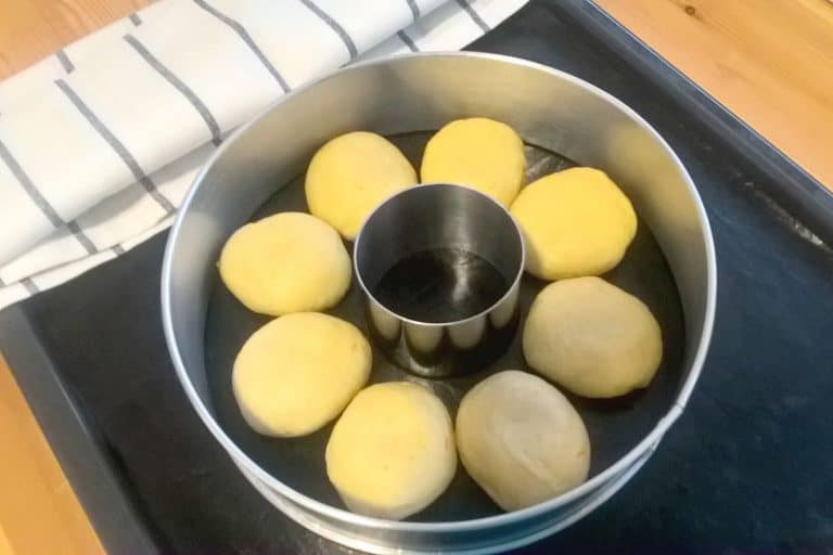 Dortovou formu před pečením potřeme tukem a položíme ji do středu plechu vyloženého pečícím papírem. Bochánky vyskládáme do kruhu do dortové formy asi dva centimetry od sebe. Pokud chceme mít věnec hezký, vložíme do středu formy malý tukem potřený kroužek (např. vykrajovací formičku, formičku na tartar nebo malou kulatou zapékací mističku). Bochánky ve formě necháme ještě alespoň 15 minut dokynout pod utěrkou, aby se spojily do věnce.