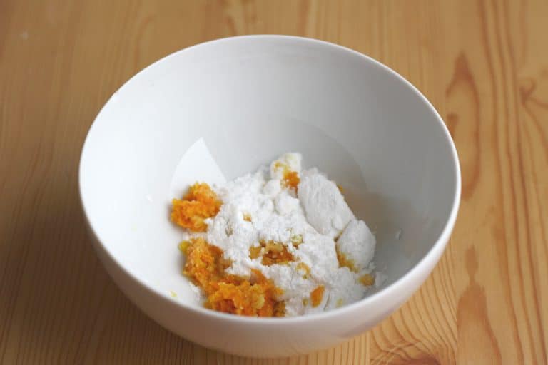 Příprava aromatizovaného cukru: Než kvásek nakyne, připravíme si aromatizovaný cukr. Na jemném struhadle ostrouháme kůru z jednoho celého citronu a jednoho celého pomeranče a v malé misce ji vidličkou důkladně promícháme s moučkovým cukrem.
