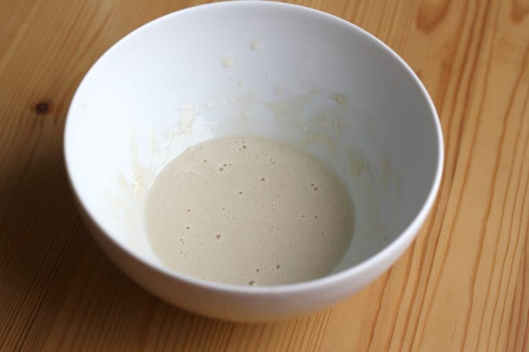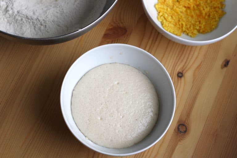 Příprava kvásku: Do menší misky nebo sklenice prsty rozdrobíme droždí, přisypeme lžičku cukru, nalijeme polovinu množství vlažného mléka (nezahříváme na víc než 40°C) a vrchovatou polévkovou lžíci mouky a společně rozmícháme na řídkou kaši. Misku přikryjeme čistou utěrkou a zadělaný kvásek necháme na teplém místě asi 15 minut kynout. Doba kynutí kvásku se může lišit podle teploty, správně nakvašený kvásek musí napěnit, vzkypět a zdvojnásobit svoji velikost.