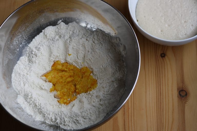 Příprava kynutého těsta: Zbylou mouku prosejeme do větší mísy, přidáme sůl a uprostřed mouky utvoříme důlek. Do důlku přidáme všechen aromatizovaný cukr, vzešlý kvásek, zbylé vlažné mléko (nezahříváme na víc než 40°C), sůl, vejce a rozpuštěné máslo (nezahříváme na víc než 40°C).