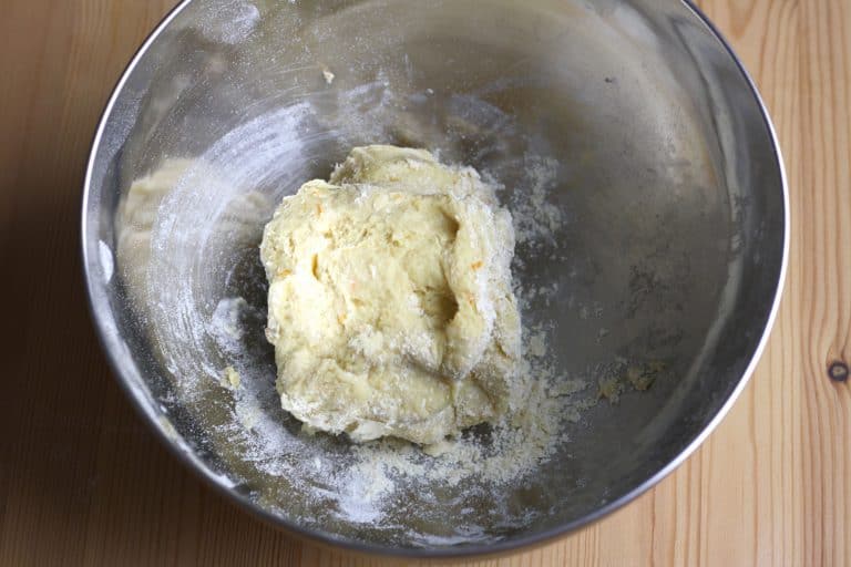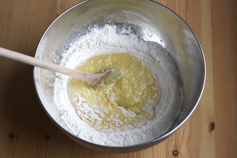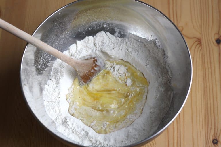 Těsto mísíme dřevěnou vařečkou od středu a postupně do něho zapracováváme všechnu mouku ze stran. Když je všechno zapracované a hnětení vařečkou začíná být namáhavé, vyklopíme těsto na vál a dále ho zpracováváme ručně. Pokud se nám těsto lepí na prsty, můžeme přidat trochu mouky, a musíme ho ještě nějakou dobu hníst. Pokud je naopak příliš tuhé a suché, při hnětení si namáčíme ruce do vody. Hotové vypracované těsto by mělo být elastické, hladké a nelepivé.