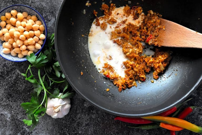 Podle počtu ingrediencí vypadá curry na náročné vaření, ale opak je pravdou. Dobré veganské kari s kokosovým mlékem není nic jiného, než vaše oblíbená zelenina ochucená kari pastou nebo speciální směsí koření. Vše se dohromady vaří v kokosovém mléce a za půl hodiny máte hotovo. Nezapomeňte na limetu, koriandr a chilli papriku!