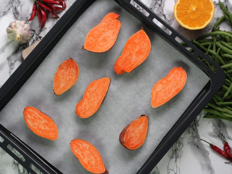 Batáty dáme do trouby předehřáté na 180°C a pečeme, dokud brambory nejsou zcela měkké, poté přepneme troubu na gril a necháme shora lehce ogrilovat.